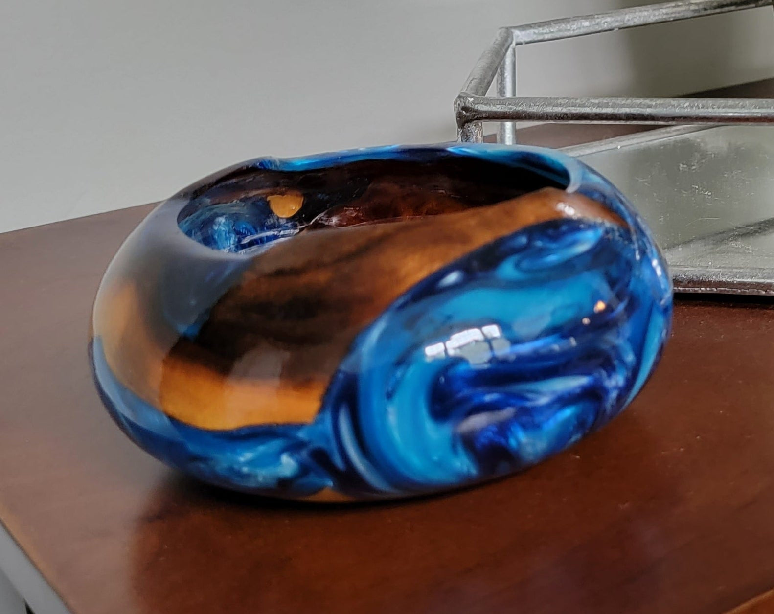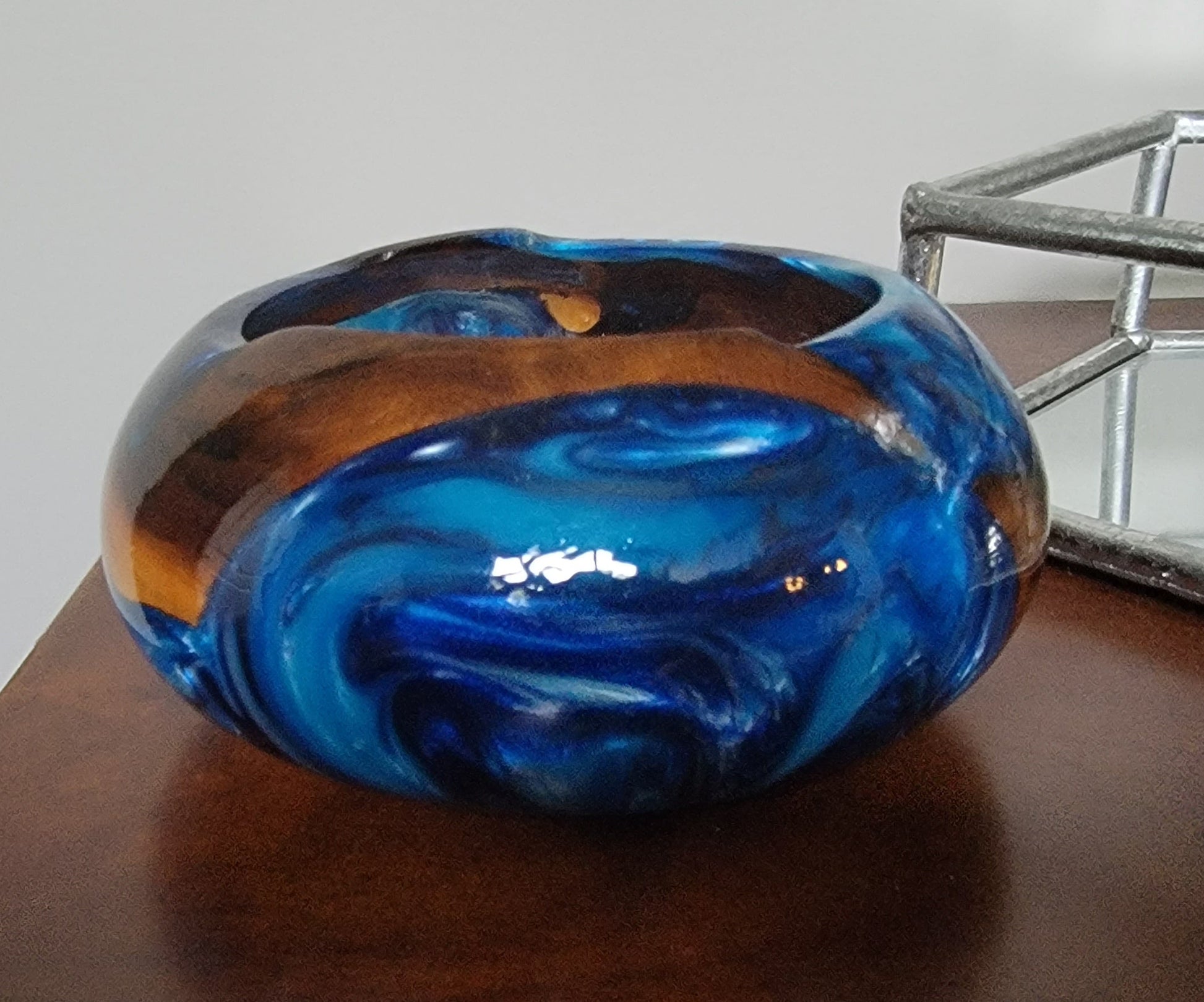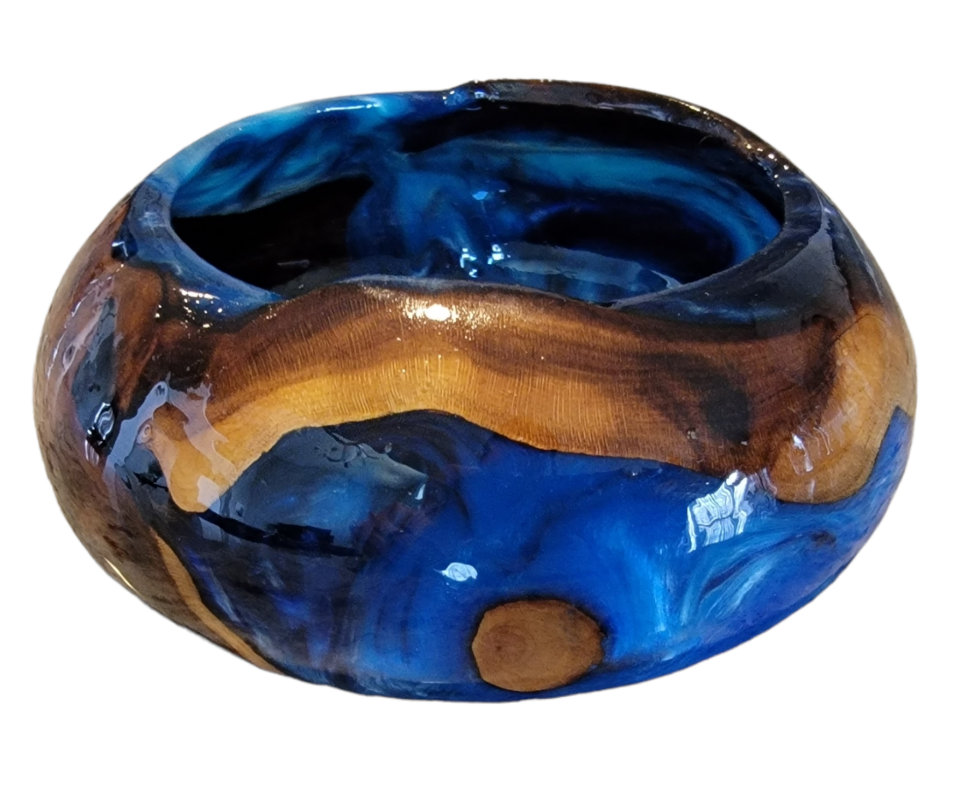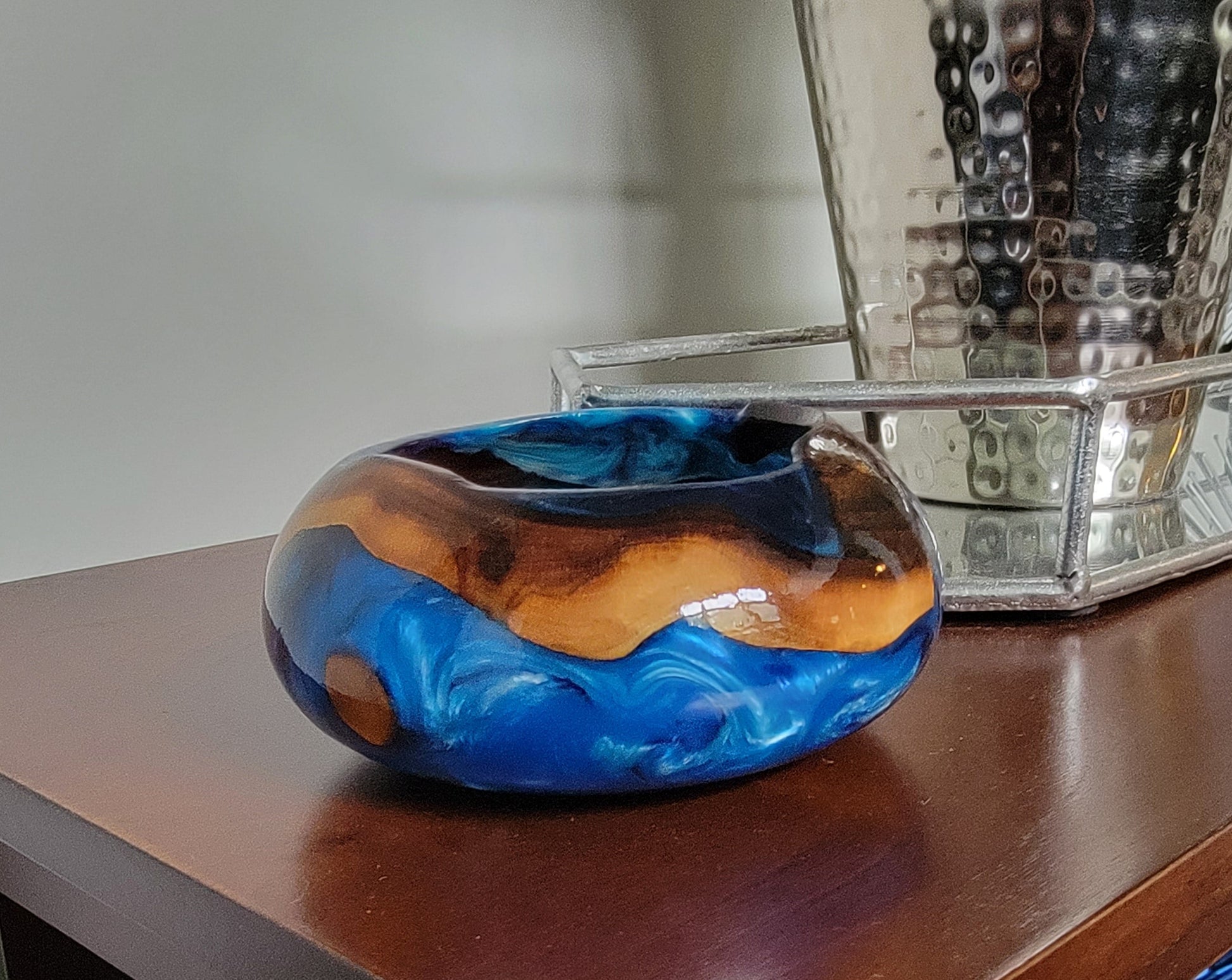 This perfectly thin bowl is named Rough Seas for more than just the obvious colors. The recessed sides were expertly shaved down while keeping the rough uneven top. The uneven top dramatically added to the level of difficulty. So much so that it lead to a lot of bruised & bloody knuckles but was definitely worth the finished appearance. Derek considers this one of his favorite and most technical pieces. This is due to the perfect 3mm thickness top to bottom, degree of difficulty, colors, and permanent high gloss epoxy resin finish.